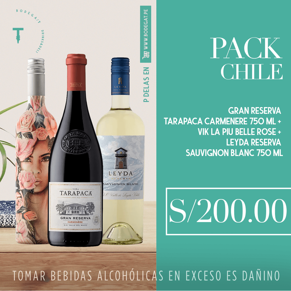 PACK CHILENO - Kit Vino Gran Reserva Tarapaca Carmenere + Vik La Piu Belle Rose + Leyda Reserva Sauvignon Blanc